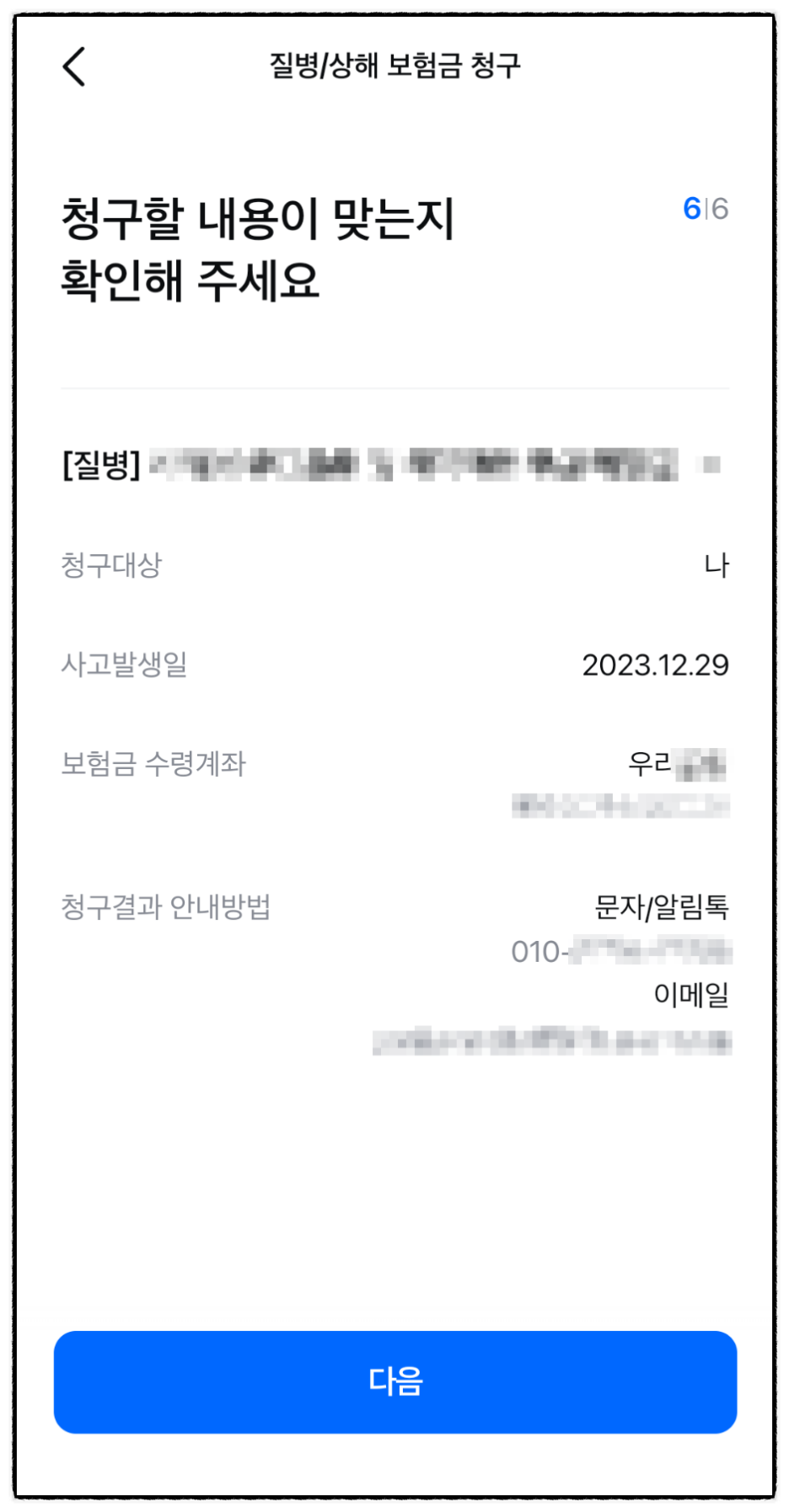 보험금 받을 계좌를 입력 > [다음] 버튼